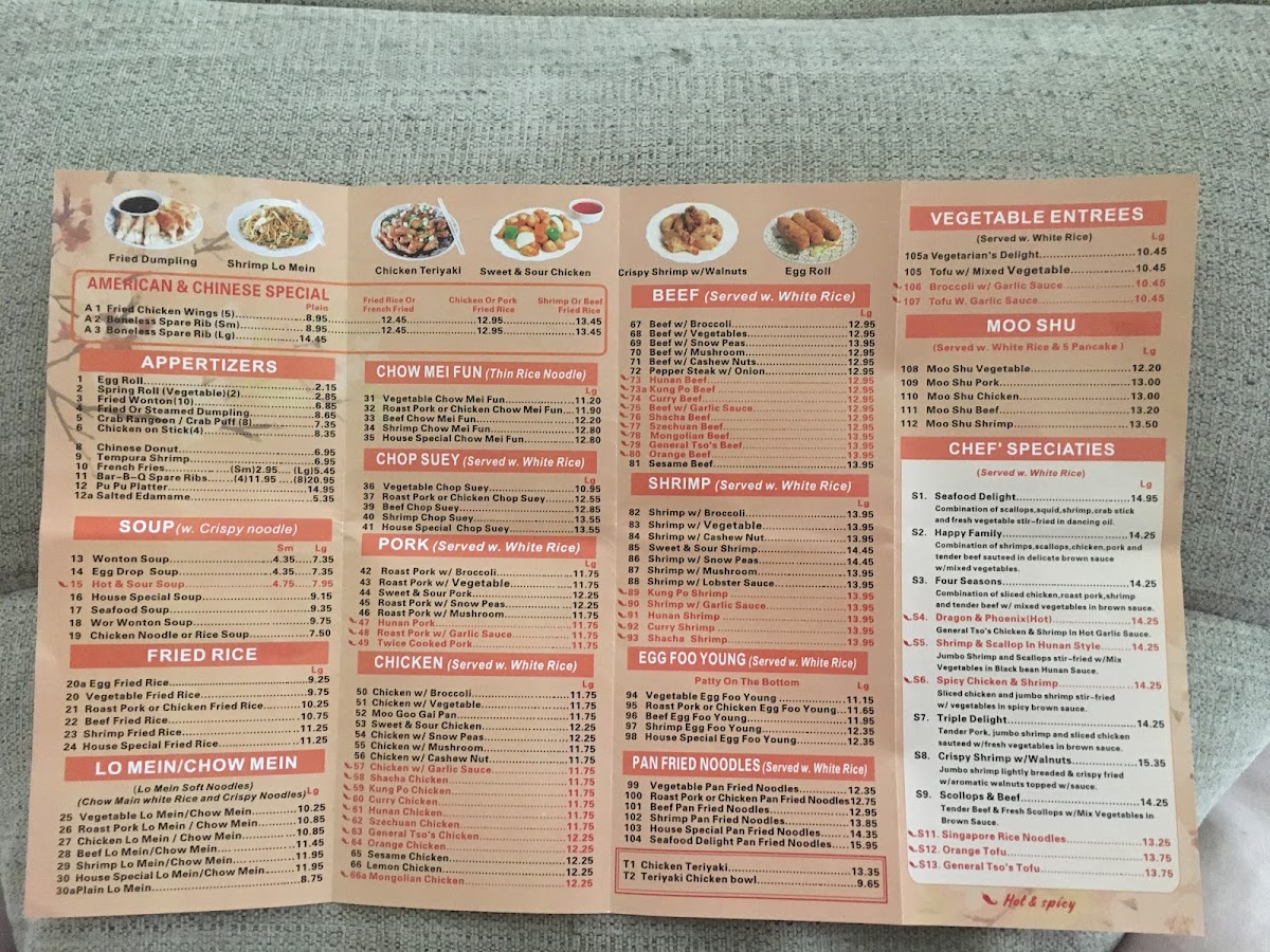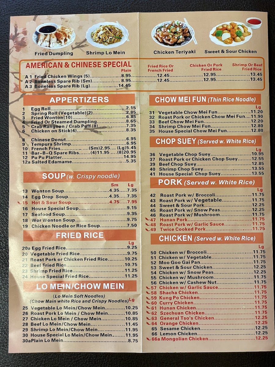 Hot and Spicy. Served with fried rice, egg roll, and soup.