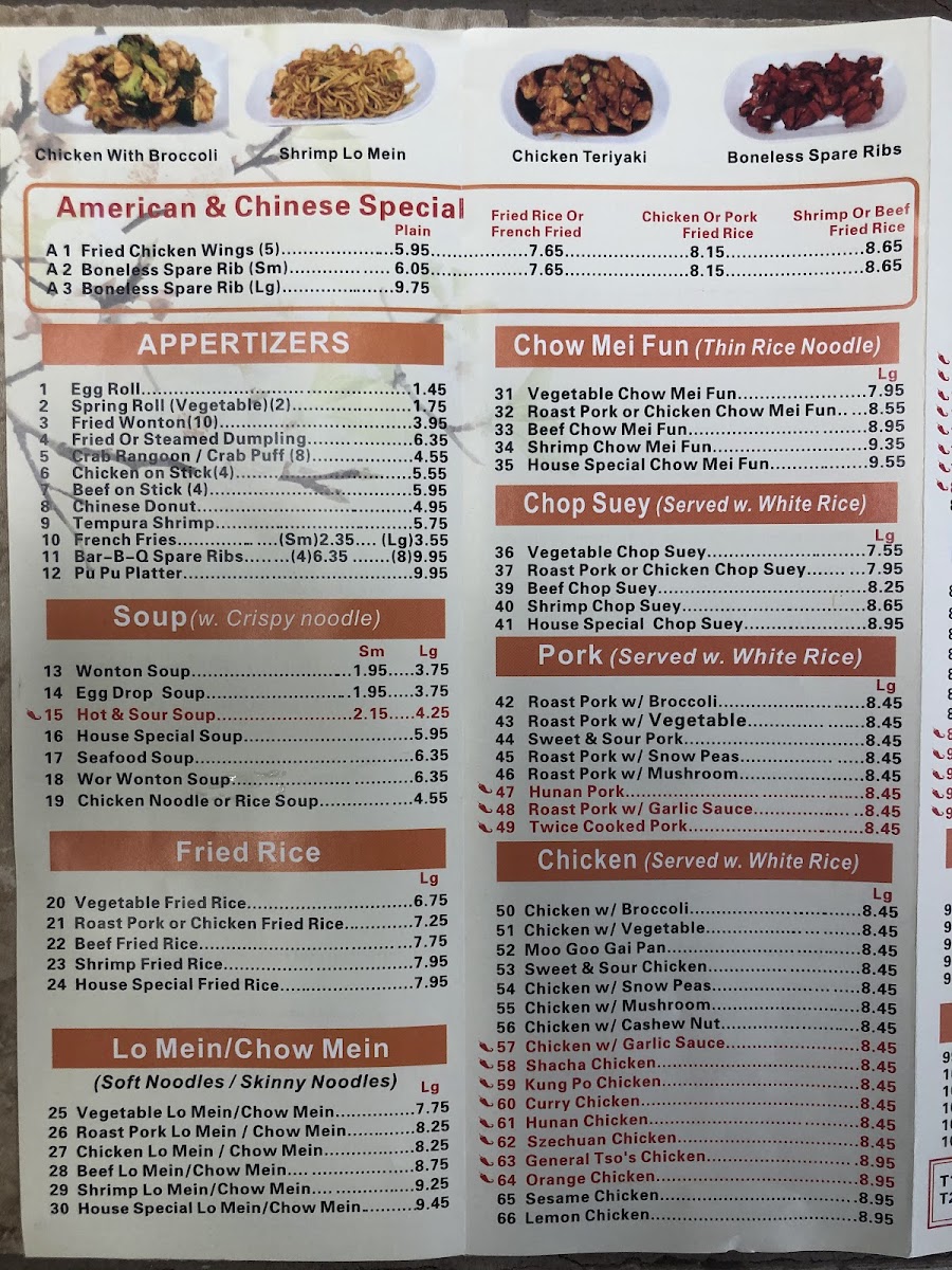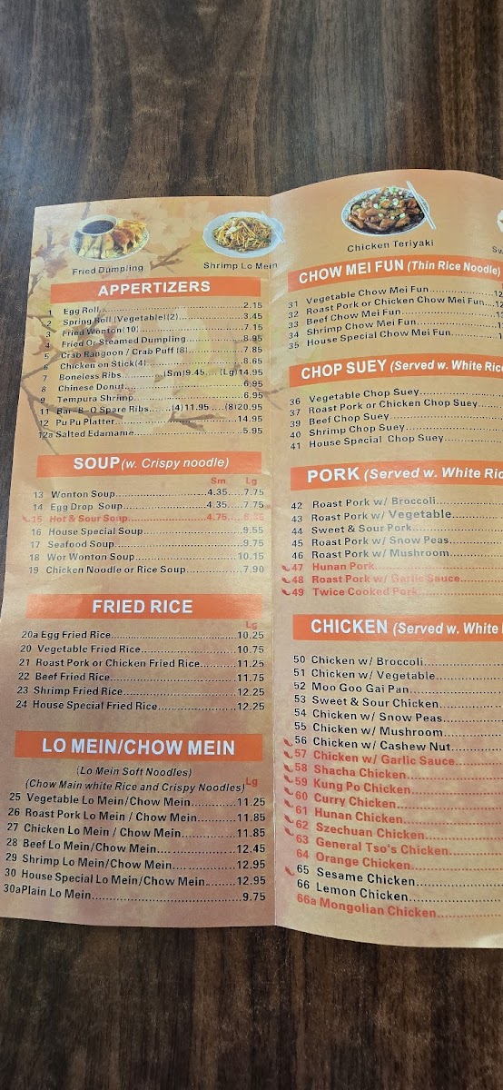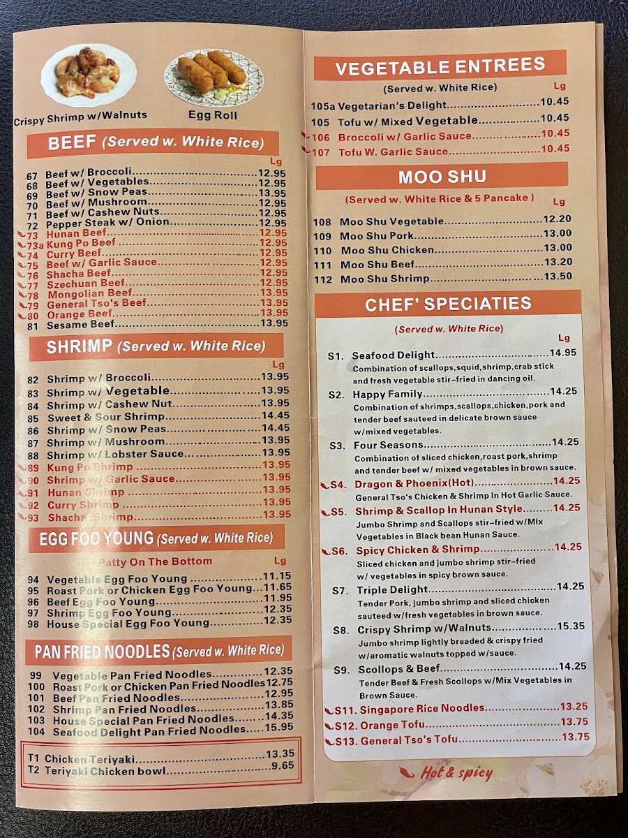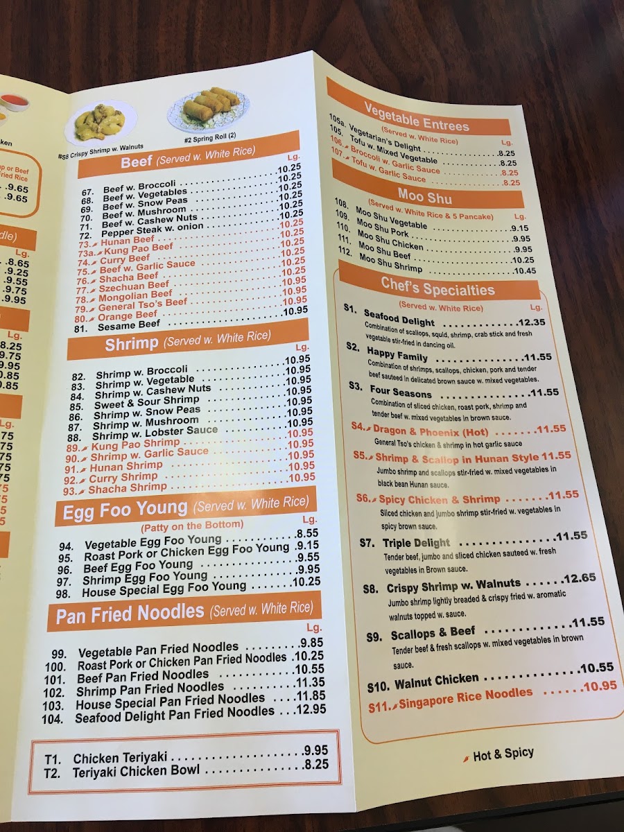 Hot and spicy. Served with fried rice, egg roll, and soup.