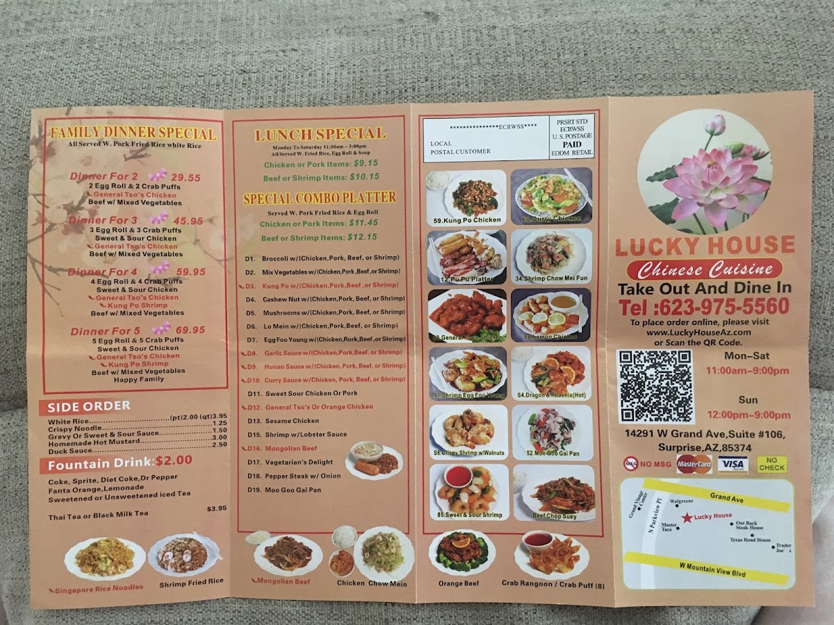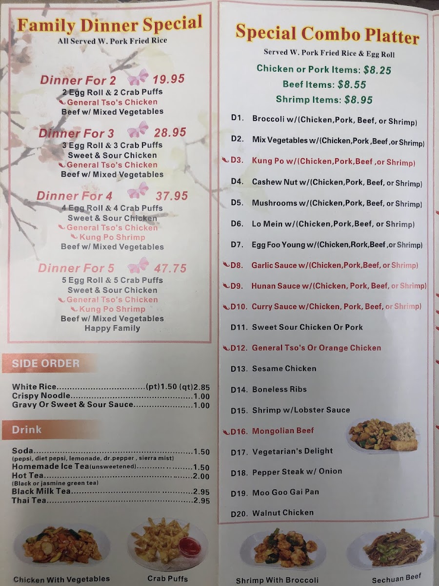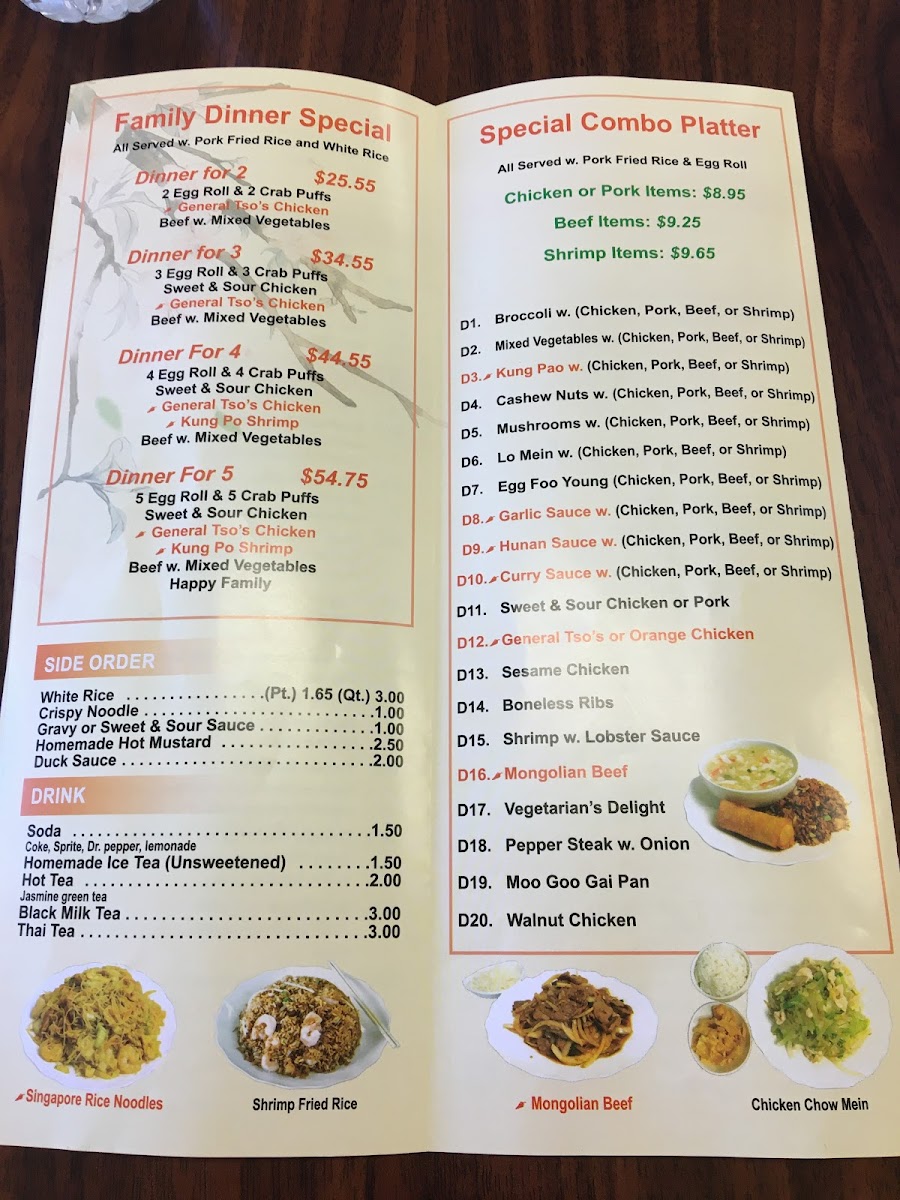 Broccoli special with choice of shrimp, beef, chicken, or pork. Comes with selected rice or lo mein, including white, fried varieties, or plain.