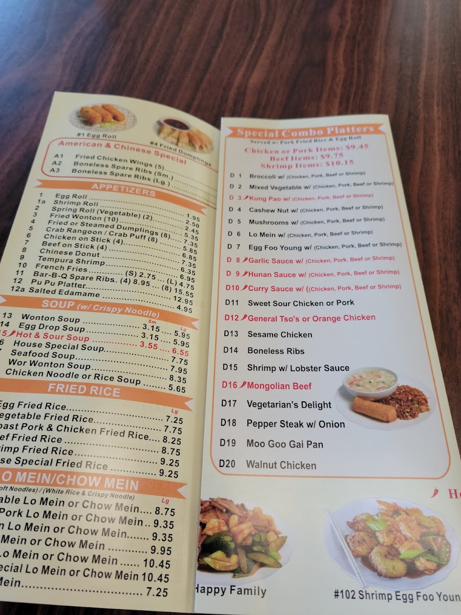 5 egg roll and 5 crab puffs,large roast pork fried rice and large white rice.sweet and sour chicken, kung po shirmp, beef with mixed vegetables and Happy family.